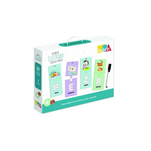 Marca: Babebi Modelo: Brinquedo Alfabeto Ilustrativo - Brinquedos para a Alfabetização Tipo: Alfabeto Colorido Ilustrado Material: madeira Composição: 26 peças + 1 canetinha Tamanho do produto embalado: 280 x 200 x 45 mm Idade mínima recomendada: a partir de 4 anos.