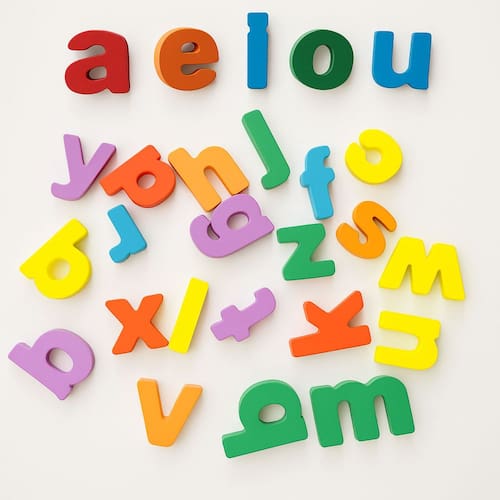 26 letras bastão minúsculas coloridas em madeira