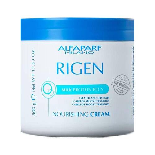 Máscara de tratamento regenerador para cabelos secos e quimicamente tratados. Alfaparf Rigen Milk Protein Plus Nourishing Cream equilibra o pH, nutre e hidrata intensamente os fios, tornando-os macios e brilhantes.