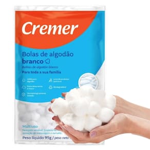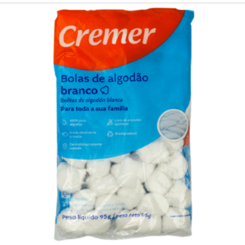 O Algodão em Bolas é confeccionado com fibras 100% algodão. Macio e absorvente, seu formato arredondado é ideal para a limpeza da pele do bebê e remoção de esmaltes e cosméticos. As bolas de algodão Cremer são isentas de impurezas, macias e extra-absorventes, devido ao tratamento especial dado às fibras do algodão. - Para a pele do bebê; - Limpeza facial; - Remoção de esmalte. Marca: Cremer
