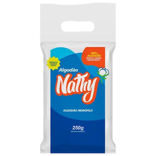 Algodão Nathy Caixa com fibras 100% algodão, super macio e absorvente, Embalado em saco plástico individual, alvejado e isento de produtos químicos tais como alvejantes ópticos, corantes corretivos e quaisquer outras que possa agredir a pele. O Algodão Nathy possui excelente capacidade de absorção e retenção de líquidos e secreções.