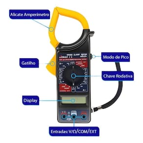 Alicate Amperímetro Digital Portátil Teste Tensão Elétrica Projetado para uso por eletricistas, técnicos e usuários que necessitam um instrumento preciso, confiável e sempre pronto para uso. A tela de cristal líquido possui mostrador de fácil leitura, para todas as condições de iluminação. O ponto decimal, posicionado automaticamente, e o sinal de polaridade negativa (-) acendem para medição em corrente contínua, o que permite uma leitura direta na unidade escolhida utilizando a chave seletora. Quando não parecer sinal, considere como polaridade positiva (+). Em caso de faixa de medição acima do permitido pelo aparelho, a tela ficará em branco (apagada). A tela também tem indicação de bateria com carga baixa. Caso isso ocorra, favor trocar a bateria por uma nova, com especificação 9.0 V zinco carbono comum ou alcalina. Itens Inclusos: - 01 Alicate Amperímetro - 02 Cabos de Teste - 01 Estojo de Proteção
