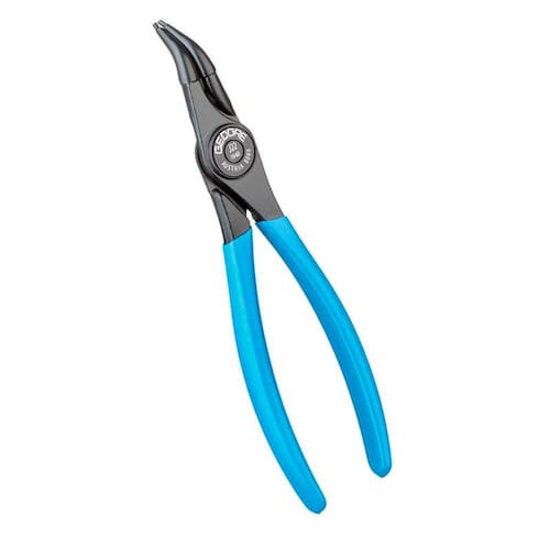Corpo em aço Gedore-Vanadium e empunhadura plastificada na cor azul padrão Gedore. Acabamento escurecido. Alicate com pontas fixas e curvas 45º. Para anéis de segurança internos conforme norma DIN 472 e DIN 984.