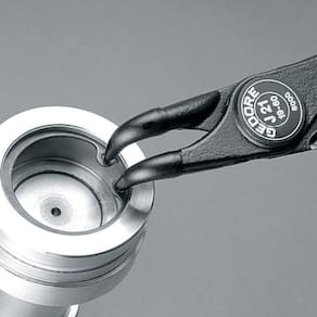 Corpo fabricado em aço Gedore-Vanadium e empunhadura plastificada na cor azul padrão Gedore. Possui acabamento escurecido. O Alicate com pontas fixas e curvas 90º é indicado para anéis de segurança internos conforme norma DIN 472 e DIN 984.