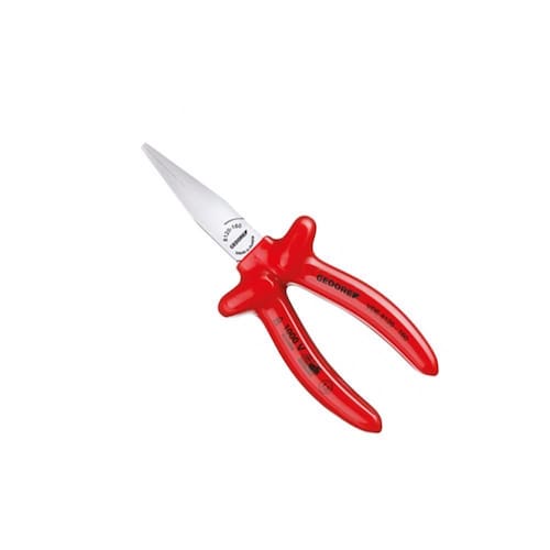 Corpo em aço Gedore-Vanadium e empunhadura em polímero anti-chamas. Acabamento niquelado, cromado e polido. Empunhadura ergonômica, com abas protetoras arredondas para maior conforto e segurança. Produzida por imersão, propiciando isolação até 1000 V, conforme norma EN 60900 / IEC 60900, submetida à ensaios de: impacto, tensão elétrica, aderência, inflamabilidade e pressão/. Utilizar ferramentas isoladas VDE, em tensão máxima de 1000 V em corrente alternada e 1500 V em corrente contínua, conforme norma EN 60900 / IEC 60900. Possui dupla camada de isolação Check-Tool, no exterior é na cor vermelha, padrão Gedore. Atende com segurança a norma regulamentadora NR 10 - Segurança em Instalações e Serviços em Eletricidade, possui certificado de isolação. Alicate de bico chato e longo, sem corte, com dentes finos em , que permite puxar, segurar e dobrar fios e cabos. Para trabalhar em montagens e reparos eletroeletrônicos. Especificações técnicas: - Referência: VDE 8120 - 160 - Tamanho: 160mm / 6.1/2 Pol. - Peso: 0,185 Kg - Corpo em aço Gedore-Vanadium e empunhadura em polímero anti-chamas. Acabamento niquelado, cromado e polido. - Empunhadura ergonômica, com abas protetoras arredondas para maior conforto e segurança. - roduzida por imersão, propiciando isolação até 1000 V. Marca: Não Informado