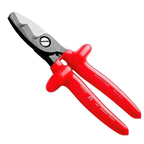 -forjada em aço cromo vanádio. -cabeça e articulação fosfatadas. -têmpera total no corpo. -têmpera por indução no gume de corte. -empunhadura com dupla camada de isolamento -isolação elétrica de 1.000 v ca. -produto em conformidade com a iec 60900 e nr 10. -indicadas para trabalhos em baixa tensão até 1.000 v em corrente alternada e 1.500 v em corrente contínua. -capacidade máxima para corte de cabos de 20 mm de diâmetro considerando a capa de pvc que cobre o cabo . -as ferramentas isoladas tramontina pro são submetidas a vários ensaios para atender às normas iec 60900 e nr 10: ensaio de impacto; ensaio de resistência dielétrica; ensaio de aderência da isolação; ensaio de flamabilidade; ensaio de isolação elétrica. -gama variada de ferramentas para aplicação segura em áreas energizadas com tensões de trabalho de até 1.000 v. -utilizada por profissionais que trabalham em áreas de risco redes energizadas e instalações industriais . -as ferramentas são produzidas e testadas de acordo com normas específicas. -a iec 60900 é uma norma internacional que especifica requisitos para a fabricação e aprovação de ferramentas isoladas. Equivalente a norma européia en 60900. -a nr 10 é uma norma regulamentadora brasileira que estabelece as condições mínimas para garantir a segurança de trabalhadores que interajam com instalações elétricas e serviços com eletricidade.