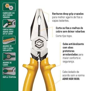 O Alicate Universal 8 Eletricista Sata é a ferramenta indispensável para realizar trabalhos de manutenção elétrica com eficiência e segurança. Com este alicate, você poderá prensar terminais, cortar fios e arames de forma precisa e fácil. Este alicate possui arestas de corte que são temperadas por indução, possibilitando um ajuste preciso e um corte de alta qualidade. Além disso, suas arestas de corte são longas, o que facilita o corte de uma ampla gama de cabos. Com ajustes controlados, este alicate oferece um desempenho de corte superior. Ele é aprovado pela NBR 9699 para isolação de cabos de até 1000V e atende aos requisitos da NR10. Uma das principais características deste alicate é o corte tipo topo, que garante um corte limpo e preciso. Ele também possui um dispositivo para prensar terminais de bitolas de até 10 mm sem isolação. O bico deste alicate conta com ranhuras cruzadas, o que proporciona um melhor agarre de fios e capas isolantes. O cabo é antideslizante e possui abas protetoras arredondadas, garantindo maior conforto e segurança durante o uso. Além disso, as ranhuras deep grip paralelas também contribuem para um melhor agarre de fios e capas isolantes. A Casa das Ferramentas é uma empresa com mais de 60 anos de experiência na venda de produtos novos e . Todos os produtos comercializados pela empresa possuem . Compre o Alicate Universal 8 Eletricista Sata na Casa das Ferramentas e tenha em mãos uma ferramenta de alta qualidade para realizar seus trabalhos de manutenção elétrica com eficiência e segurança. Perguntas frequentes: 1. Qual é a capacidade de corte deste alicate? R: Este alicate possui capacidade de corte de uma ampla gama de cabos. 2. Posso utilizar este alicate para cortar fios de cobre? R: Sim, este alicate corta fios e malhas de cobre sem deixar rebarbas. 3. Este alicate possui isolamento para cabos de até quantos volts? R: Este alicate possui isolamento para cabos de até 1000V, conforme aprovado pela NBR 9699 e NR10. 4. O cabo deste alicate é antiderrapante? R: Sim, o cabo deste alicate é antiderrapante, proporcionando maior segurança durante o uso. 5. Este alicate possui ? R: Para informações sobre , com a Casa das Ferramentas. Marca: Não Informado