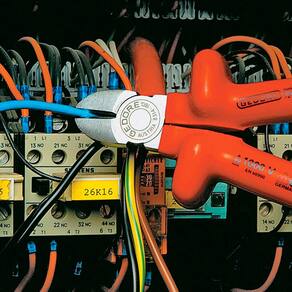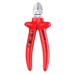 Corpo em aço Gedore-Vanadium e empunhadura em polímero anti-chamas. Acabamento niquelado, cromado e polido. Empunhadura ergonômica, com abas protetoras arredondadas para maior conforto e segurança. Produzida por imersão, propiciando isolação até 1000 V, conforme norma EN 60900 / IEC 60900, submetida à ensaios de: impacto, tensão elétrica, aderência, inflamabilidade e pressão. Utilizar ferramentas isoladas VDE, em tensão máxima de 1000 V em corrente alternada e 1500 V em corrente contínua, conforme norma EN 60900 / IEC 60900. Possui dupla camada de isolação Check-Tool, no exterior é na cor vermelha, padrão Gedore. Atende com segurança a norma regulamentadora NR 10 - Segurança em Instalações e Serviços em Eletricidade, possui certificado de isolação. Tratamento térmico total e corte temperado por indução, com dureza de 63 - 65 HRC. Com cabeça estreita ideal para espaços reduzidos. A geometria do corte está posicionada em diagonal ao corpo do alicate. Indicado para corte de arame com dureza média, diâmetro máximo de 1,6 mm e com resistência à tração 1600 N/mm². Para trabalhar em montagens e reparos eletroeletrônicos.