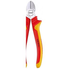 Corpo em aço Gedore-Vanadium e empunhadura em polímero anti-chamas nas cores vermelho e amarelo, padrão Gedore. Acabamento niquelado, cromado e polido. Empunhadura ergonômica e antideslizante, com abas protetoras arredondadas para maior conforto e segurança. Produzida por injeção, propiciando isolação até 1000 V, conforme norma EN 60900 / IEC 60900, submetida à ensaios de: impacto, tensão elétrica, aderência, inflamabilidade e pressão/. Utilizar ferramentas isoladas VDE, em tensão máxima de 1000 V em corrente alternada e 1500 V em corrente contínua, conforme norma EN 60900 / IEC 60900. Atende com segurança a norma regulamentadora NR 10 - Segurança em Instalações e Serviços em Eletricidade, possui certificado de isolação. Ratamento térmico total e corte temperado por indução, com dureza de 63 - 65 HRC. Com cabeça estreita ideal para espaços reduzidos. A geometria do corte está posicionada em diagonal ao corpo do alicate. Indicado para corte de arame com dureza média, diâmetro máximo de 1,6 mm e com resistência à tração 1600 N/mm. Para trabalhar em montagens e reparos eletroeletrônicos. O alicate Ref. VDE 8314- 160 H é fornecido em blister para autosserviço. Especificações técnicas: - Referência: VDE 8314 - 160 H - Tamanho: 160mm / 6.1/2 Pol. - Capacidade máxima de corte de arame com dureza média e resistência à tração 1600 N/mm: 1,6 - Peso: 0,231 Kg - Corpo em aço Gedore-Vanadium e empunhadura em polímero anti-chamas nas cores vermelho e amarelo, padrão Gedore. - Acabamento niquelado, cromado e polido. - Empunhadura ergonômica e antideslizante, com abas protetoras arredondadas para maior conforto e segurança. - Produzida por injeção, propiciando isolação até 1000 V, conforme norma EN 60900 / IEC 60900. Marca: Não Informado