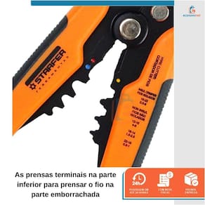 O Alicate Decapador e Crimpador é ideal para trabalhos elétricos, cortar, descascar, decolar e crimpar fios de 0,5mm a 6,0mm. Seu design com cabo emborrachado se adapta facilmente à mão, já a parte do corte é feita em aço temperado com lâmina de alta performance. A versatilidade do alicate com limitador de plástico permite controlar o tamanho do corte do fio. - O pino serve para você regular e facilitar o aperto;- As prensas terminais na parte inferior para prensar o fio na parte emborrachada;- Ajuste o seletor de acordo com a bitola do fio a ser decapado;- Mordentes em aço Cr12Mov, dureza Hrc 55-60, para todos os tipos de cabos 10AWG;- Para terminais isolados 22-10 AWG 0.5-6.0mm2 ;- Para terminais não isolados 12-10 AWG 4.0-6.0mm2 ;- Para terminais não isolados 16-14 AWG 1.5-2.5mm2 ;- Para terminais não isolados 22-18 AWG 0.5-1.0mm2 . CARACTERÍSTICAS TÉCNICAS:Material: Aço temperado e polipropilenoMedidas: 203mm - 8 comprimento Peso: 0,360kgMarca: StarferRef.: 1311166