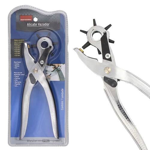 O Alicate Vazador Com Cabeça Giratória da Western é a ferramenta perfeita para quem busca praticidade e qualidade em suas atividades diárias. Com ele, você poderá fazer furos precisos em diversos materiais, como couro, cortiça, EVA, borracha, papelão e muito mais.