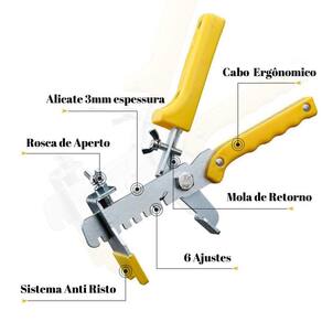 Alicate Nivelador Assentar Piso Pocelanato Ceramica Azulejo Alicate de Nivelação de Piso em aço carbono forjado e temperado, com cabo ergonômico projetado para tornar o trabalho mais confortável e eficiente. Este alicate é a escolha perfeita para quem busca qualidade e precisão em seus projetos de colocação de porcelanatos e revestimentos cerâmicos. Com seu cabo ergonômico, este alicate proporciona uma aderência firme e confortável para o usuário, além de contar com um plástico especial que oferece proteção extra e maior aderência, tornando mais fácil impelir cunhas diagonais para dentro de clips de plástico. O alicate de nivelação de piso é perfeito para travar as cunhas nos clips, garantindo uma colocação uniforme e nivelada do piso. Com sua construção em aço carbono forjado e temperado, você pode ter certeza de que este alicate durará por muitos projetos e anos de uso. Não perca a chance de experimentar a qualidade e a precisão deste alicate de nivelação de piso. Adquira já o seu e garanta resultados profissionais em seus projetos de colocação de pisos e revestimentos cerâmicos. Dados Técnicos: Composição em Aço Carbono e Polipropileno Acompanha:1 Alicate Nivelador de Piso 1 Adaptador para Sistema Slim