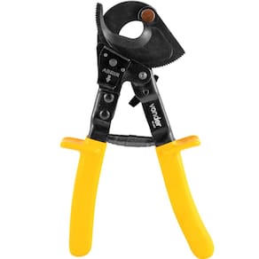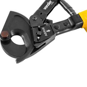 Possui cabo plastificado e mola que auxilia a abertura. Além de acionamento tipo catraca, proporcionando uma operação mais eficiente. Indicado para cortar cabos de cobre e alumínio de até 32,0mm.