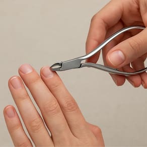 Com o auxílio do Alicate Mundial Professional Cabo Longo, retire a cutícula acompanhando o formato das unhas.