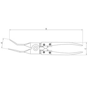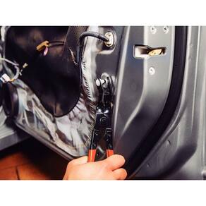 Corpo em aço carbono. Têmpera total no corpo. Cabo com revestimento plástico. Possui mola de retorno facilitando a utilização. Indicado para remover travas de fixação localizados em acabamentos internos e forração de automóveis. Tamanho: 240 mm