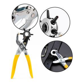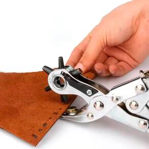 Alicate perfurador, ideal para trabalhos em couro, papel e PVC. Conta com 6 tamanhos de perfuração: 2,5mm, 3mm, 3,5mm, 4mm, 4,5mm e 5mm. A parte metálica é fabricada em aço 45 com acabamento cromado, garantindo alta durabilidade e resistência. A alça é revestida em borracha, oferecendo conforto durante o uso e melhor ergonomia. Seu design robusto e funcional permite trocas rápidas entre os tamanhos com fixação firme, sendo perfeito para aplicações como perfuração de cintos, bolsas, etiquetas, folhas e muito mais.
