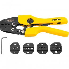 1 Alicate e 5 jogos de prensa terminais (mordentes) intercambiáveis, sendo: 1 jogo para prensar terminais tipo pino tubular (de 1 mm a 6 mm), 1 jogo para prensar terminais tipo pino tubular (de 6 mm a 16 mm), 1 jogo para prensar terminais tipo não isolados anel e forquilha (garfo) (de 1,5 mm a 6 mm), 1 jogo para prensar terminais tipo não isolados macho e fêmea (de 1 mm a 4 mm) e 1 jogo para prensar terminais tipo pré-isolados forquilha (garfo), macho, fêmea e anel (de 0,5 mm a 6 mm)