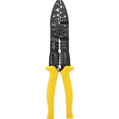 Indicado para prensar terminais pré-isolados fêmea, macho, forquilha (garfo), anel e pino, não isolados anel e forquilha (garfo), para cortar fios e cabos de 0,5 mm² a 5,5 mm² e parafusos M2,6 - M3,5 - M4 e M5, além de desencapar fios e cabos de 0,5 mm² a 5,0 mm².
