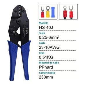 Especificações técnicas: - modelo - hs-40j - bitola do cabo: de 0,25 até 6,0 mm - material do corpo: aço - material do cabo: pp - aplicação: para prensagem e crimpagem de terminais isolados - awg: 23-10 - comprimento: 230mm - peso: 650 gramas