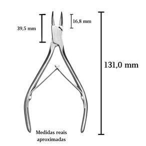 Alicate fabricado em aço inoxidável de alta qualidade, com lâminas finas e alongadas ideal para cortes precisos em regiões estreitas. O modelo conta com molas duplas para movimento leve, cabo ergonômico e acabamento polido. Dimensões aproximadas: comprimento total 13,1 cm; área ativa de corte 39,5 mm; peso 70 g. Produzido com materiais resistentes à corrosão e compatível com métodos convencionais de higienização. Indicação de uso: cortes finos e ajustes delicados que exigem precisão e controle em tarefas manuais.