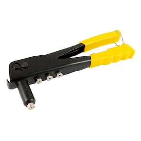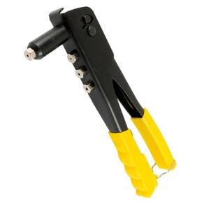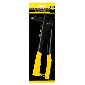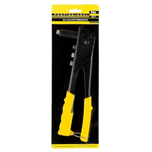 Alicate Rebitador EDA é uma ferramenta específica para aplicação de rebite pop na fixação de metais, lonas e couro. Alicate Rebitador da EDA tem a empunhadura emborrachada e a estrutura feita de aço. Possui um eficiente sistema de molas e ponteiras para 4 diâmetros de rebites. Media: 9,5 polegadas (24cm)