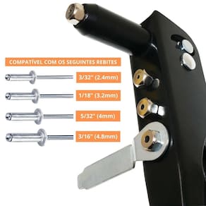 Material: corpo em aço carbono Mecanismo: manual Chave de aperto: sim Capacidade de rebites: 2,4mm / 3,2mm / 4,0mm / 4,8mm Marca: fertak