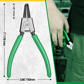 SK Alicate de anel de pressão de 17 cm, alicate de anel externo com mandíbula dobrada de 90 graus, aço CR-V premium - Feito de aço CR-V premium com um acabamento preto para resistência superior à ferrugem, os alicates de anel de pressão são tratados termicamente para alcançar força e ductilidade, garantindo que possam suportar pressão sem deformação - As pontas são polidas e revestidas com acabamento eletroforético preto, melhorando a dureza e a resistência à corrosão enquanto reduzem o desgaste, prolongando a vida útil do alicate - As alças ergonômicas e antiderrapantes são projetadas para se ajustar à curva da palma da mão para reduzir a fadiga da mão e fornecer aderência segura ao trabalhar. O mecanismo acionado por mola permite uma operação estável com uma mão - Com um diâmetro de ponta de 0,2 cm, o alicate de clipe C tem um design de ponta fina dobrada com excelente força de fixação, garantindo o alinhamento preciso de anéis de retenção e peças pequenas, tornando-os ideais para trabalho flexível em espaços apertados - Os alicates externos são perfeitos para instalar e remover anéis de retenção colocados externamente. Amplamente utilizado em reparos automotivos, fabricação de máquinas e eletrodomésticos
