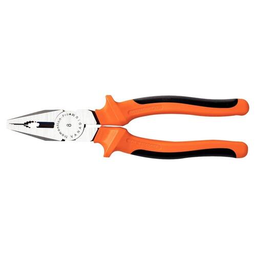 Alicate Universal 8 Tramontina 44001108 Características: 1. Os alicates de corte são testados quanto à resistência ao desgaste do gume de corte em máquina de ensaio específica. 2. Os alicates possuem dureza diferenciada no gume de corte e no corpo. 3. Os alicates também são testados com relação à aderência das empunhaduras de PVC. 4. Um ensaio de extrema importância analisa o grau de isolação do revestimento aplicado sobre os cabos dos alicates isolados, e que promove segurança na sua utilização em locais com tensões de até 1.000 V CA. 5. Puxar, prender, enrolar, deformar e cortar arames e chapas finas. 6. As ferramentas são produzidas e testadas conforme normas específicas.