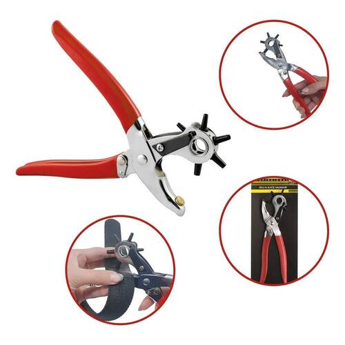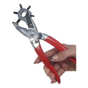 O modelo é Furador de cinto Furador de chinelo Furador de couro Furador de tapete Furador de EVA Alicates Furador de couros, com 6 bicos diferentes para atender a todas as suas necessidades de perfuração. Apesar de não possuir cabo ergonômico, seu tamanho de 9 polegadas proporciona um manuseio confortável e seguro.