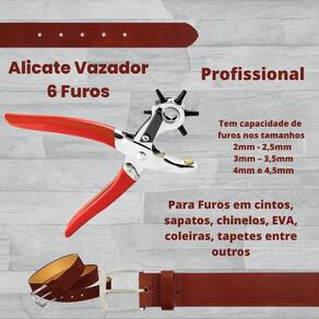 Este alicate vazador é versátil e prático, com capacidade para fazer furos de 2 mm a 5 mm de diâmetro. Com ele, você pode criar designs personalizados em couro, EVA, tapetes, cintos e chinelos com facilidade e precisão.