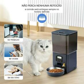 Características: - qualidade, bem estar, durabilidade e confiança; - seu pet mais saudável com porções bem distribuídas ; - tranquilidade em saber que o seu animal está recebendo seu alimento, na hora certa; - botão com proteção se o seu animal tocar o botão não mudará a programação ; - gravação: a função permite que você grave sua voz ou algum som para que seja emitido antes da refeição do seu animal. Você pode gravar 10 segundos; - cada porção tem cerca de 5 gramas. Você pode definir o tamanho da refeição para 1-40 porções ou seja, entre 5 gramas e 200 gramas , conforme as necessidades do porte do seu animal de estimação; - a bandeja de aço inoxidável higiênica e fácil de limpar ; - tanque de alimentos removível e fácil de limpar; - base é estável e antiderrapante.