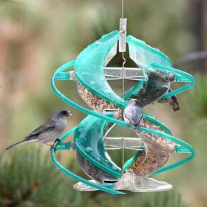 - Mais pássaros permanecem por mais tempo; poleiros helicoidais contínuos permitem que os pássaros se movam para cima e para baixo no comedouro