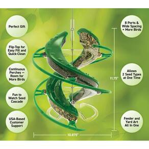 O alimentador de sementes Cascade® DNA™ Songbird permite 2 tipos de sementes em um alimentador, poleiros contínuos, design helicoidal, 8 portas