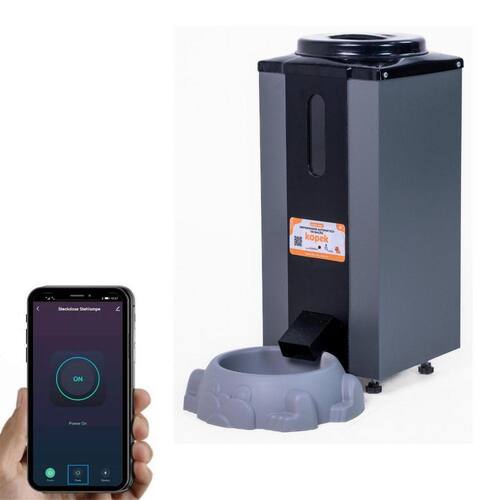 O Comedouro para cães KVS-200 da Kopek necessita de Wi-Fi e é compatível os sistemas operacionais Android e IOS e os Assistentes virtuais Alexa e Google Assistente, permitindo programar os horários e a quantidade de cada refeição do seu pet, e também pode fazer reforço extra da refeição remotamente.