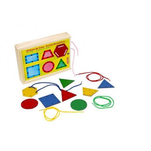 Composto por 24 peças e 05 cordões coloridos, esse brinquedo é perfeito para as crianças aprenderem de forma divertida. As 6 formas geométricas coloridas podem ser alinhavadas na tampa da caixa de madeira, que possui o formato de um estojo.