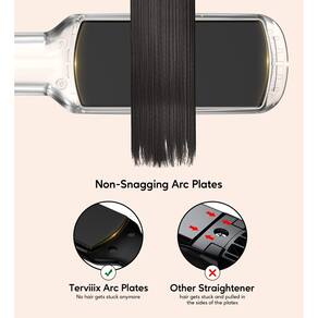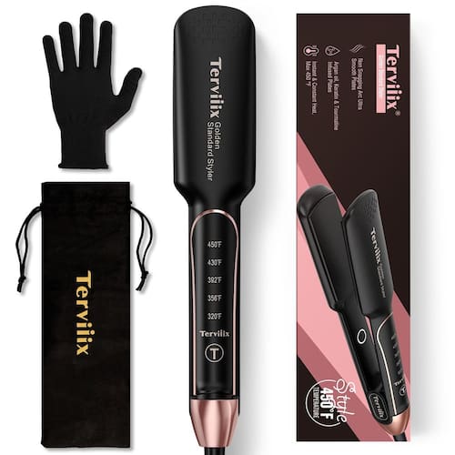 Alisador de cabelo plano da Terviiix – Cerâmica e turmalina para resultados suaves, de um deslize, ferro de alisamento de 3,5 cm de largura para salão de beleza, alisa suavemente cabelos grossos, encaracolados, pretos e naturais - AKT CERAMIC TECH. : A chapinha de cerâmica Terviiix é infundida com óleo de argan, queratina e turmalina para nutrir seu cabelo enquanto modela, concentra rapidamente o calor, reduzindo danos térmicos e levando a resultados duradouros - Design de arco e características de segurança: o design de placas flutuantes 3D de borda curva em arco evita que o cabelo fique preso, enquanto a voltagem dupla de 100-240 V o torna perfeito para viagens. O desligamento automático de 60 minutos garante o uso seguro, e o cabo giratório de 2 m oferece flexibilidade - Configurações de aquecimento variáveis e tecnologia inteligente de controle de temperatura. : Com 5 configurações de calor (320 ~ 232 °C), nossa chapinha serve para todos os tipos de cabelo. O chip de alta precisão torna a faixa de flutuação de temperatura menor do que a chapinha comum. Aquecimento PTC avançado aquece em apenas 30 segundos para economizar seu tempo - Alisador de cabelo e modelador 2 em 1: o alisador de cabelo largo Terviiix Golden Standard Styler permite que você alise, enrole e crie ondas de praia com facilidade, dando a você sempre um cabelo perfeito para salão de beleza - ATENDIMENTO AO CLIENTE: Se você tiver alguma dúvida ou preocupação, nossa equipe de atendimento ao cliente está disponível 24 horas por dia, 7 dias por semana para ajudá-lo