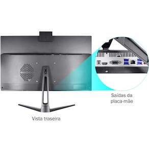Painel traseiro: 1 × DC (19V) | 1 × VGA | 1 × Rj45 | 1 × HDMI | 4 × USB3.0 | 1 × Áudio Out | 1 × Mic In