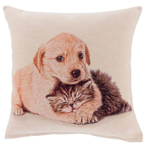 Capa de almofada em Gobelino Amigos, dupla face, 45x45cm, produzida em tapeçaria de jacquard europeu de produção artesanal e limitada com toque muito agradavel.