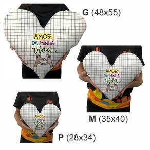 DESCRIÇÃO DO PRODUTO1. Almofadas no formato de coração em 3 tamanhos: Tamanho P 28x34cm, tamanho M 35x40cm e tamanho G 48x55cm;2. Impressão / estamparia de alta qualidade, em tecido pelúcia, super macio, antialérgico e muito sedoso.