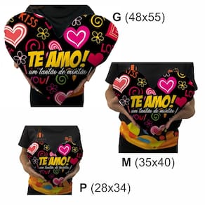 DESCRIÇÃO DO PRODUTO1. Almofadas no formato de coração em 3 tamanhos: Tamanho P 28x34cm, tamanho M 35x40cm e tamanho G 48x55cm;2. Impressão / estamparia de alta qualidade, em tecido pelúcia, super macio, antialérgico e muito sedoso.