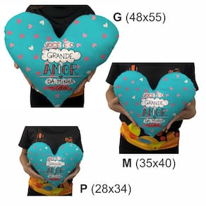 DESCRIÇÃO DO PRODUTO1. Almofadas no formato de coração em 3 tamanhos: Tamanho P 28x34cm, tamanho M 35x40cm e tamanho G 48x55cm;2. Impressão / estamparia de alta qualidade, em tecido pelúcia, super macio, antialérgico e muito sedoso.