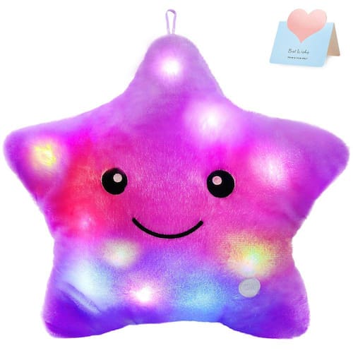 - Esta é uma boa almofada de pelúcia para mostrar aos seus filhos o que é uma estrela e como brilhar. Este travesseiro tem um botão de pressão, quando você pressiona, ele pode acender. Durante o processo, a luz mudará de cor e você poderá desligá-la a qualquer momento se pressionar o mesmo botão novamente. Se você esquecer de desligá-lo, a linda estrela se desligará automaticamente em 30 minutos. AVISO: Não o limpe na água, pois a luz LED está instalada. São necessárias 3 pilhas AA, mas as baterias não estão incluídas.