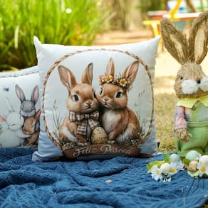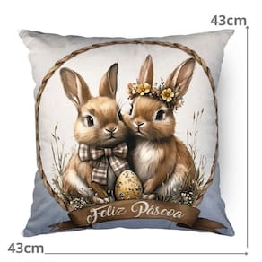 Contém: 1 Almofada com enchimento em fibra siliconada. Tamanho: 43 x 43 cm Material: Veludo Detalhes: Sem aplicações Fechamento: Zíper Invisível Forma: Quadrada Cor: Azul, bege e marrom Estampa frente: Casal de Coelhos Estampa verso: Casal de Coelhos Produto: Nacional
