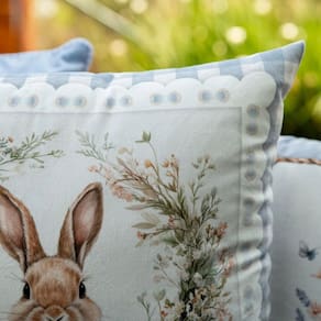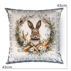Contém: 1 Almofada com enchimento em fibra siliconada. Tamanho: 43 x 43 cm Material: Veludo Detalhes: Sem aplicações Fechamento: Zíper Invisível Forma: Quadrada Cor: Azul, bege e verde Estampa frente: Coelho, cenouras e floral Estampa verso: Coelho, cenouras e floral Produto: Nacional