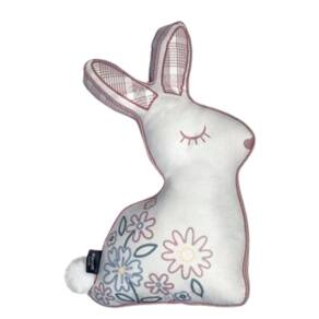 Contém: 1 Almofada com enchimento em fibra siliconada. Tamanho: 30 x 48 cm Material: Velveteen tecido aveludado com um leve canelado Detalhes: Bordado e aplicação, cordonê e pompom Forma: Formato Coelho Cor: Rosa e off white Estampa frente: Floral e xadrez Estampa verso: Rosa Produto: Nacional