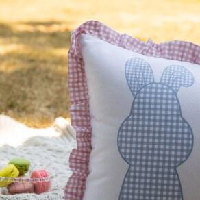 Contém: 1 Almofada com enchimento em fibra siliconada. Tamanho: 35 x 55 cm Material: Velveteen tecido aveludado com um leve canelado Detalhes: Babado Fechamento: Zíper Invisível Forma: Retangular Quebra rim Cor: Rosê, azul e amarelo Estampa frente: Coelhos e Xadrez Estampa verso: Rosê liso Produto: Nacional