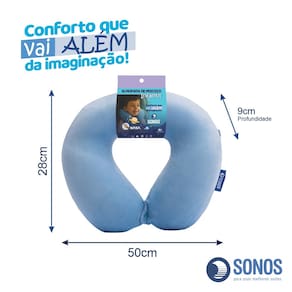 - Modelo: Almofada de Pescoço Infantil Sonos - Idade recomendada: A partir de 4 anos - Tamanho: 28 x 50 x 9 cm (altura x largura x profundidade) - Peso líquido: 0,230 kg - Peso bruto: 0,280 kg - Enchimento: Espuma viscoelástica (NASA) - Capa: Tecido macio respirável - Tipo de embalagem: Pacote plástico personalizado - EAN Azul: 7898559703847 - EAN Lilás: 7898559703854 - Origem: Indústria Brasileira - Marca: Sonos