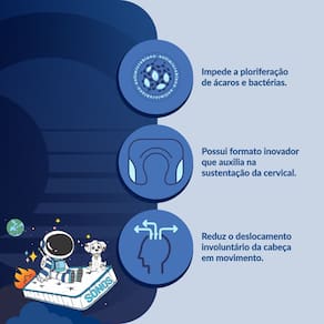 - Espuma viscoelástica (tecnologia NASA) para suporte e conforto - Formato anatômico que auxilia na sustentação da cervical - Reduz o deslocamento involuntário da cabeça durante o sono - Capa respirável e suave ao toque - Tecnologia antimicrobiana contra ácaros e bactérias - Ideal para viagens, passeios ou cochilos em movimento