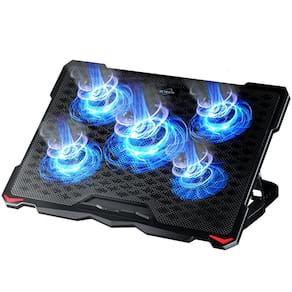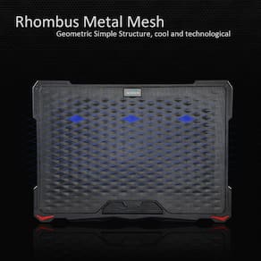 Esta almofada de resfriamento com ventilador de laptop pode acomodar laptops de até 17,3" em uso na mesa. A almofada de resfriamento para laptop tem uma grande ventoinha central com duas ventoinhas menores em cada lado (5 ventiladores no total). A parte superior do suporte para ventiladores do laptop é construída com malha de metal e as laterais e a parte inferior são de plástico