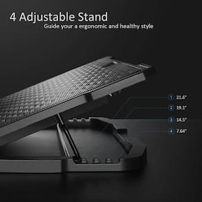 A base de resfriamento do computador pode ajudar a aumentar a altura de 2,4" para 4,8", e os ângulos estão disponíveis para serem ajustados de 7,5 a 21,5 graus. Ajuda a aliviar a dor no pescoço ca pelo uso prolongado do PC e pela postura incorreta.